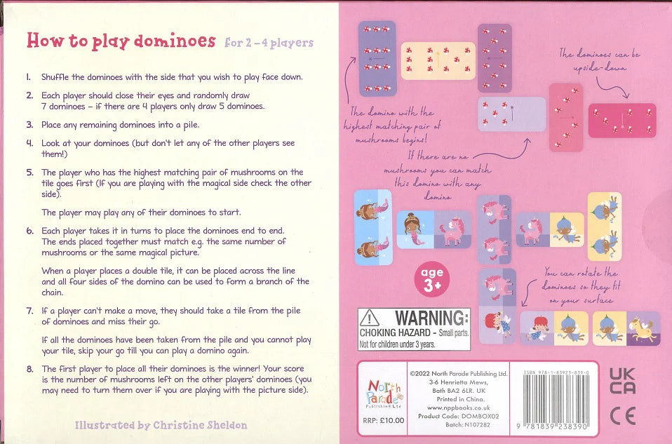 Magical Dominoes an enchanting matching game with 28 double-sided pieces. All instructions are printed on the back on the box and suitable for 2-4 players
